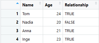 relationship <- c(TRUE, FALSE, TRUE, TRUE) #in a dataset the question yes or no is marked as TRUE or FALSE